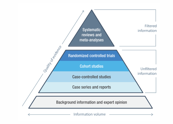 From these cases where old drugs are used in novel ways, clinicians can start building a knowledge base for future studies. This building of studies on top of each other can be illustrated by using a pyramid (below is the same version of this pyramid that Dr. Cass used in her report):