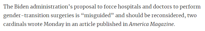 It’s inhumane and medically unsafe for Catholic hospitals to do this. Their religious beliefs, though protected, should not be allowed to override a patient’s safety. Thus the lie that hospitals would be forced to perform gender-transition surgeries is purposeful, serving to conceal and protect extreme policies. The Catholic Church’s real objection is to protecting patients from the sort of religious zeal which forces doctors to act in ways that are antithetical to safety and continuity of care for trans people. Catholic leaders, and Catholic media, just don’t want you to know it.