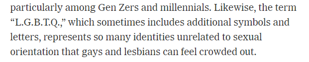 The above comes near the beginning of the column. It’s not just an aside, which means it’s not just secondary. We can therefore throw out anything Paul says about the negative connotations of the word queer specifically, for example that it’s got a negative connotation of also meaning weird, while gay has a positive connotation of meaning happy, because they must not have gotten to the heart of the matter, unless they apply to LGBTQ+ equally.
