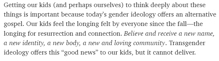 What’s perhaps most interesting, more than dreary advice on how to gaslight the next generation into becoming culture warriors like mum and daddy, is what the authors write about the struggle between their version of Christianity and the existence of transgender people.