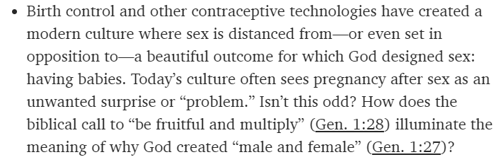 That’s anodyne enough, but there are some truly awful suggestions in this essay. Reading it as a trans person it’s hard not to picture a home environment that thrives on gaslighting and borders on abuse. The authors main suggestions are an array of leading questions which center a false idea that all children who question their gender identity are confused, and can be gently corrected into loving and accepting their god-ordained, biologically based, sex roles. It’s somewhat disturbing stuff, so we thought we’d share an example where they’ve strayed seamlessly into a totally seperate evangelical hobbyhorse, namely, birth control: