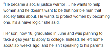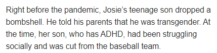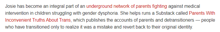 The article doesn’t clearly state that “Josie” began her activism even before her daughter left home and ceased all contact, but it seems likely that living with a parent whose views were so extreme contributed. These sorts of anti-trans parent groups are notorious in the trans community for hosting open conversations about abusive practices such as cutting off all contact with peers, removing children from home, forcibly cutting their hair, etc, to prevent their children from transitioning. It has been suggested that the “detransitioned” children these groups then surface may well be the result of these abusive practices.