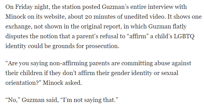 This was false, and a longer version of the interview that was posted by WJLA Friday night proves that Sinclair could and should have known it was. When asked directly if non-affirming parents were committing abuse, Guzman told Minock it was not true.