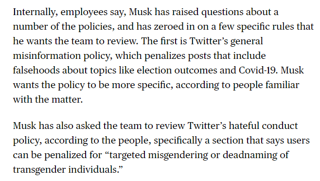 Elon Musk’s top two priorities at Twitter are relaxing rules on misinformation and misgendering trans people, at least according to reporting in a Bloomberg story with four bylines: Kurt Wagner, Edward Ludlow, Jackie Davalos, and Davey Alba. Wow! This sure seems relevant to the Assigned Media project:
