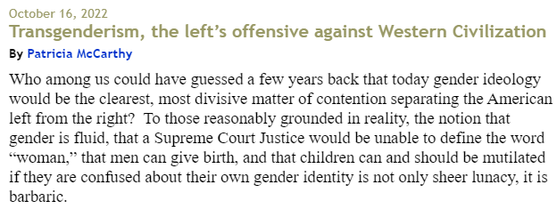 To summarize McCarthy, the left is evil. They (we?) are intentionally trying to destroy the country by giving people gender issues. This strategy, while being completely unnatural, wrong, and against god, is also super-powerful, because people are sheep who have no idea what gender they are until somebody tells them. Only conservatives can restore the commonfolk to their true genders, which are a matter of basic science (but not advanced science, because advanced science is part of the conspiracy). The writer also, it seems, may be a fan of our website: