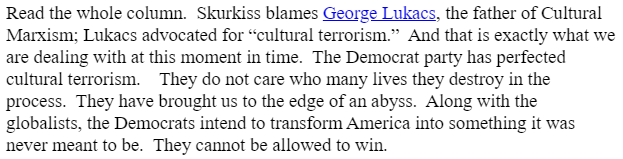 Remember, though, there’s nothing ominous about this! It’s merely the author’s informed opinion that a minority group with sky-high poverty, homelessness, and unemployment, have brought the country “to the edge of an abyss.” and “cannot be allowed to win.” Left hanging (because this is an intellectual essay), is the unwritten phrase: no matter how much blood has to be spilled to stop them.