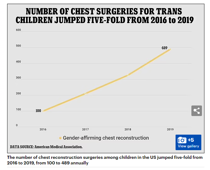 The graph above represents the total number of chest surgeries on transgender youth in the entire US, and is sourced to the American Medical Association (most likely based on this research letter). It shows chest surgeries increasing from 100 to 489 between 2016 and 2019.