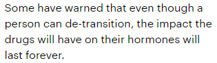 The Mail presents this and another (far less well-sourced) graph as evidence that banning evidence-based treatment is a sensible course of action for the Florida Medical Board. They also present the testimony of anti-trans detransition activists, anecdotes that are not even representative of people who detransition, much less having a bearing on the roughly 99 percent of trans people who do not detransition. We also noticed an interesting contradiction in the copy about puberty blockers.