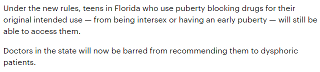 Here, the text admits these drugs are well known, not experimental, and considered safe to use for this age group even by the Florida Board of Medicine who are banning them in gender affirming contexts. But further down: