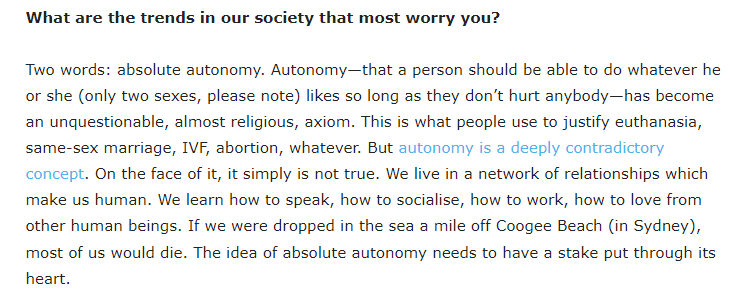 For a sample of Cook’s perspective, here’s a screenshot from his interview with Catholic Weekly (linked above), where he discusses his hatred of bodily autonomy.
