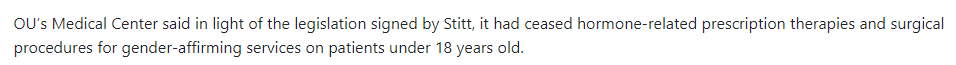 Stitt’s call for a total ban on these treatments, which coincides with a major disingformation campaign in the conservative and far right press smearing these treatments, came alongside his signing of a bill authorizing funding for the University of Oklahoma Medical Center. The funding bill banned the health center from using funds for “gender reassignment” treatments on patients under 18. As a result, OU has ceased providing these services to young trans patients.