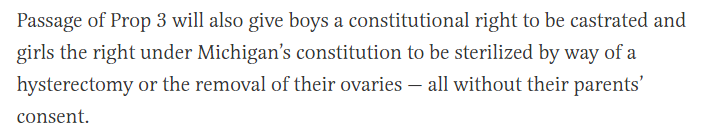 Exactly how WPATH guidelines would interact with Michigan law is not clear, but nothing about the proposed law or the guidelines for gender-affirming treatment suggests that teenagers would ever earn the sudden right to access castration or hysterectomy on demand. To say the proposed amendement would allow that is ridiculous.