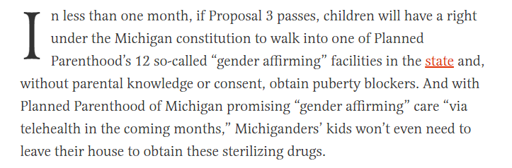 I’m not saying that Margot Cleveland of the Federalist is desperate to find something, anything, to scare Michigan voters out of codifying the rights of women to access an abortion, but I’m also not not saying that. The staunchly conservative, anti-abortion, legal correspondant for the Federalist seems to want to make Prop 3, which would protect Michigan women’s right to reproductive freedom according to ballotpedia, about trans children.