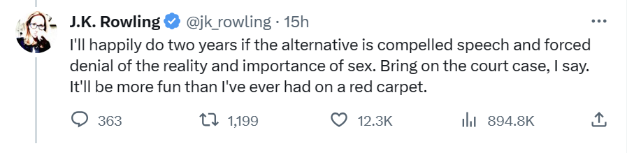 The latest tweets are far from the worst or most outrageous Rowling has produced, having previously referred to trans women as “trans-identified males” and linked them to criminality. Before that, in a podcast appearance, Rowling once suggested that she’d like to see trans women physically attacked by cis men if they tried to use women’s restrooms.