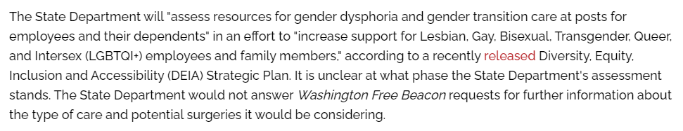 Today in conservatives pretending to be even dumber than they possibly could be in reality, we have a news item about how diplomats and their families are able to access health care for gender dysphoria, dependent on whether the treatment they need is offered by the country where they’re stationed.