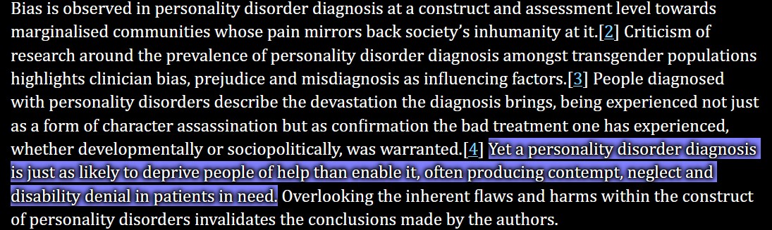 In a later review of the research, the author of the Iranian study found data ranging from 15 percent of trans people to their own study’s estimate of around 80 percent of trans people with a personality disorder of some kind. However, it should be noted that this review too has flaws, best seen in this brief response article. It details problems like a lack of construct validity in how these personality disorders are assessed in the literature, issues with clinician bias and misdiagnosis in the literature, difficulty applying these concepts to transgender populations, and – perhaps most important – the huge stigma associated with getting diagnosed with a personality disorder.