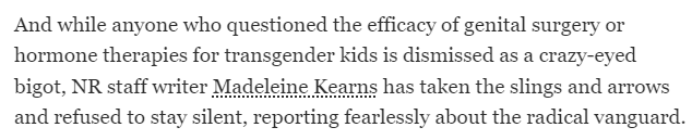 The real story is a bit more complicated (though nothing in the Times piece is untrue). If you’re curious, Evan posted a thread that went a little further into the details of who got banned (both Molloy and Pesca) and why. But basically all this is just a pretext for the National Review to raise money based on the idea that real journalists are silly (even though they’re relying on real journalists at the Times for the reporting here), and the National Review is worth supporting. As evidence they cite the false story that COVID-19 is not of natural origin, the false story that Joe Biden is suffering from dementia, and of course the false stories about gender affirming care.