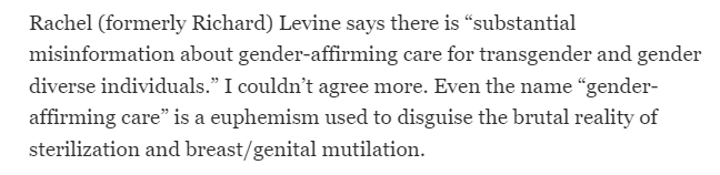 This morning the National Review has a short piece on misinformation in health care. Surely this is understandable. After all, misinformation is something people from all walks of life should be concerned about in a time of pandemic. But what’s this? Oh dear. The premise of this piece is that the real misinformation is coming from the Biden administation’s assistant secretary for health, Dr. Rachel Levine, and that the misinformation consists of her saying that there’s a lot of misinformation around gender affirming care. Ugh. OK. Fine.
