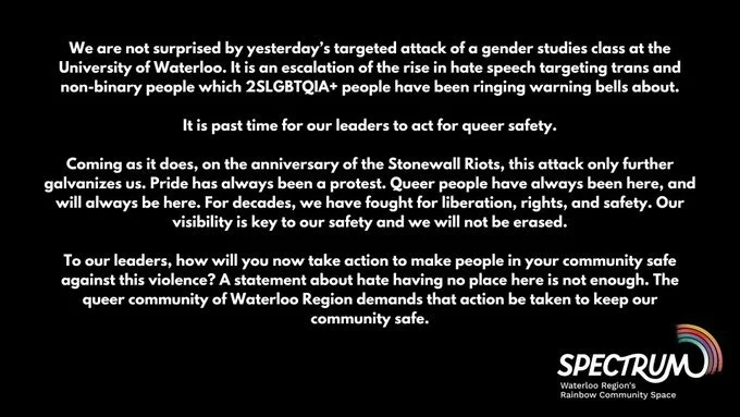 UPDATE 6/26/23 3pm: A Waterloo Regional Police statement confirmed suspicions about the motive in an attack yesterday on a gender studies class saying “investigators believe this was a hate-motivated incident related to gender expression and gender identity.”